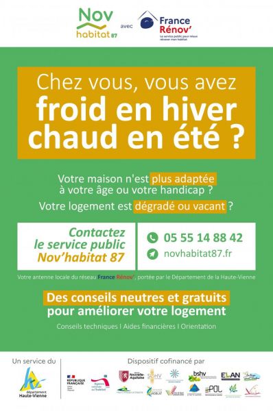 Nov’habitat 87 est le service public de conseil en amélioration du logement en Haute-Vienne (hors territoires de Limoges Métropole et Ouest Limousin). Il s’agit de l’antenne locale du réseau national France Rénov’, portée en régie par le Département de la Haute-Vienne.