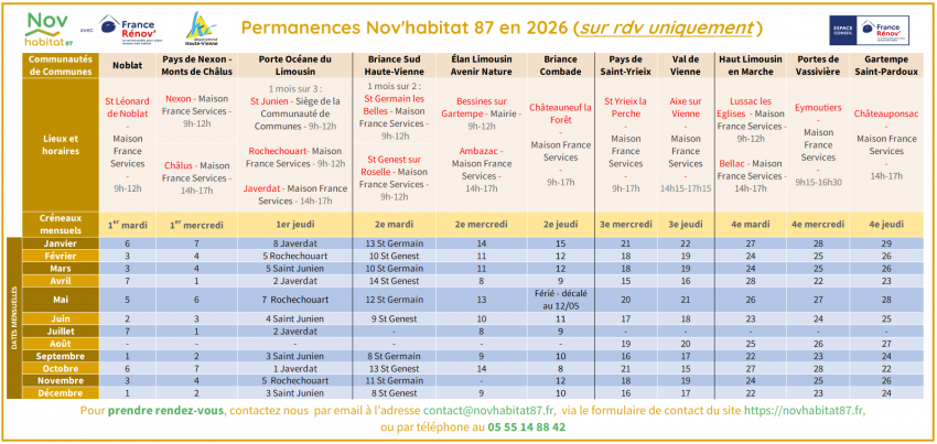 Nov’habitat 87 peut vous renseigner par téléphone ou email, mais aussi lors des permanences sur rendez-vous organisées mensuellement dans la plupart des Maisons France Services du territoire couvert.