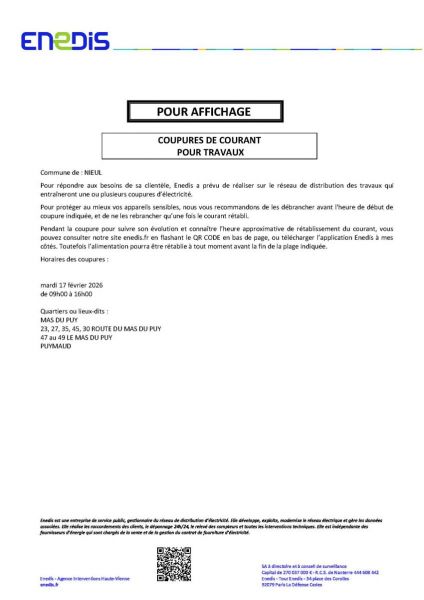 ENEDIS a prévu de réaliser sur le réseau de distributribution des travaux qui entraineront une ou plusieurs coupures d'électricité le